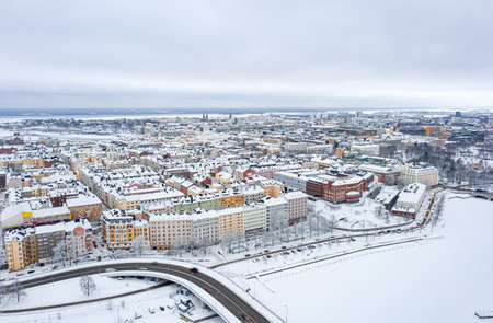 Aerial view of Kruununhaka central neighborhood of Helsinki. An amazing winter cityscape.