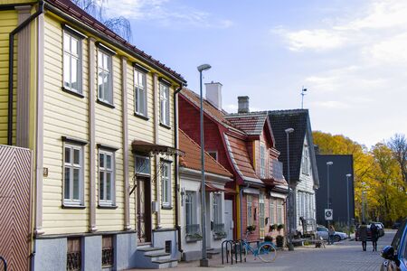 Old village wooden house in Parnu, Estonia. Village near baltic sea, resort for summer holidays. Famous travel destination in Estonia.
