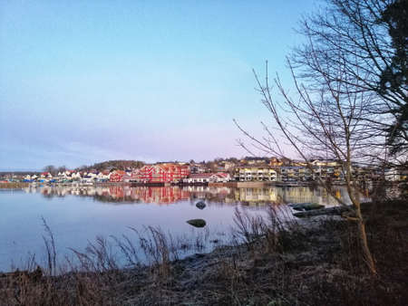 Picturesque summer houses painted in traditional falun red on dwellings island of the Stockholm archipelago in the Baltic Sea in the early morning.
