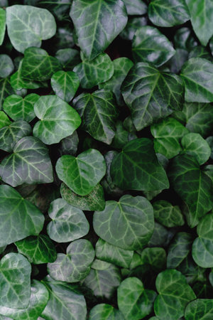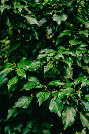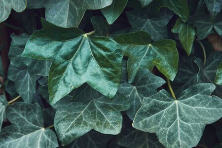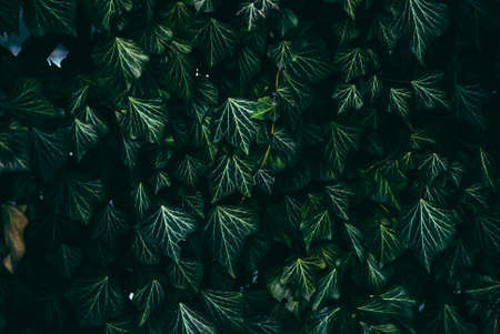 Dark nature background of detailed sharp ivy leaves with copy space – Lush garden or park vegetation of small decorative plants in dim light