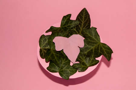creatively arranged green leaves and one pink leaf on a pink background creative art background for copy space space leaves as if levitation in the air