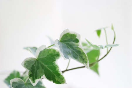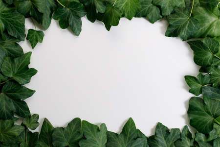 A flat lay image featuring two green ivy vines with variegated leaves framing a white background. The vines are placed in opposite corners of the image, creating a natural border. The white background provides a clean and minimalist backdrop for the vines.