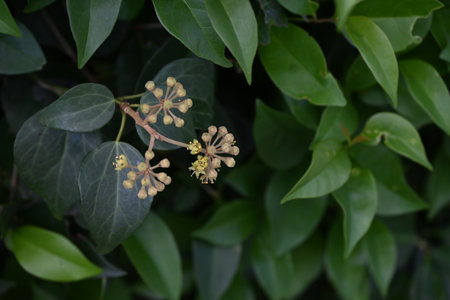Japanese ivy (Hedera rhombea) flowers. Araliaceae evergreen vine. Small five-petaled flowers with yellow anthers bloom from October to December.