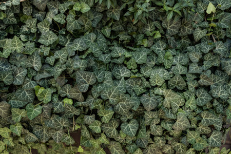 Background with many green leaves of Hedera helix, the common ivy, English or European ivy plant in an autumn garden, beautiful outdoor monochrome background
