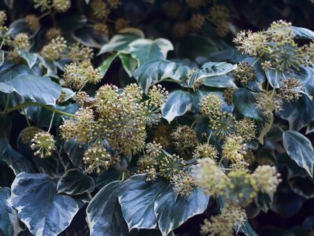 Ivy flower close-up. Evergreen plant.