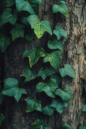 Close-up of green ivy leaves climbing up rough tree bark, highlighting the contrast between the smooth leaves and textured bark.