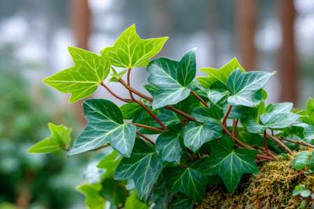 Ivy plant with fresh green leaves climbing on a mossy surface, showing natural growth
