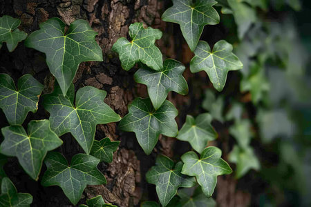 Close up of ivy leaves on a tree in the forest.