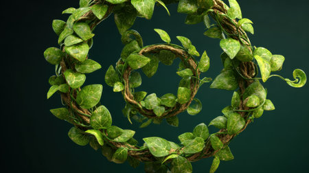 A striking arrangement of green vines and leaves in circular formations, showcasing organic beauty contrasted against a softly lit background.