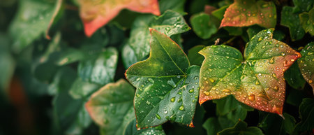 Close up photo of beautiful green ivy with raindrops on leaves.