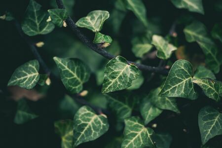Green ivy leaves with white details after rain – Dark background of lush forest vegetation – Beautiful and young plants in dim light