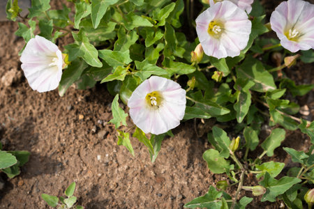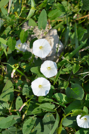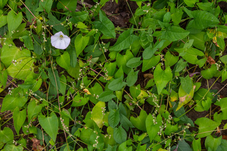 The bunch of Field bindwee or Fiddle-leaf morning-glory white flower on ground also Field bindweed is a non-native, long-lived perennial