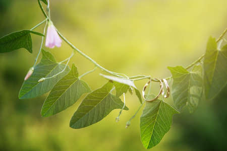 wedding rings on the stem of a creeper with a purple flower, background, place for text