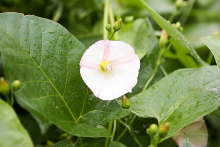 Field bindweed or Convolvulus arvensis European bindweed Creeping Jenny Possession vine herbaceous perennial plant with open and closed white flowers surrounded with dense green leaves.