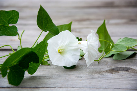 Loach with white flowers on a wooden background. Floral background.