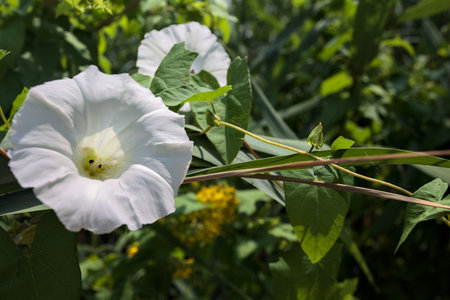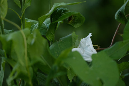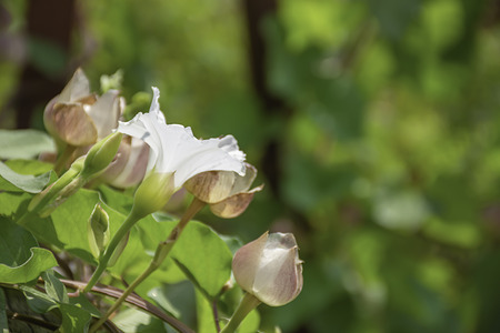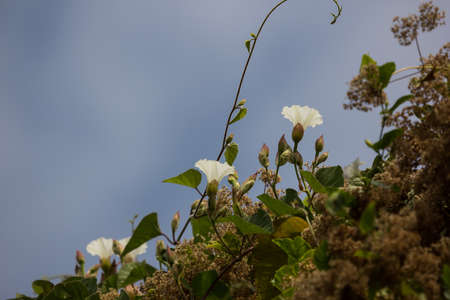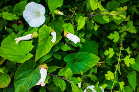 White trumpet flower, buds and leaves of the hedge bindweed (Calystegia sepium) a persistent perennial weed that twines around other plants, copy space, selected focus, narrow depth of field