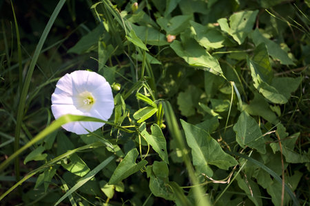 Hedge Bindweed. A white hedge bindweed Calystegia sepium winds elegantly through tall grass. The funnel-shaped flower appears both delicate and wild.