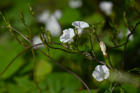 Ipomoea lacunosa (Pitted morning glory) flowers. Convolvulaceae annual vine. Star-shaped white flowers bloom from summer to autumn.