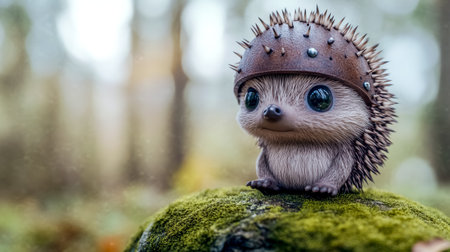 Charming hedgehog wearing a studded leather helmet sits serenely on a moss covered rock in a softly lit, magical forest setting, creating a whimsical and enchanting scene