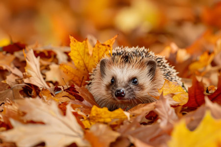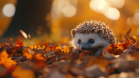 AI Generated. Adorable hedgehog nestled in autumn leaves