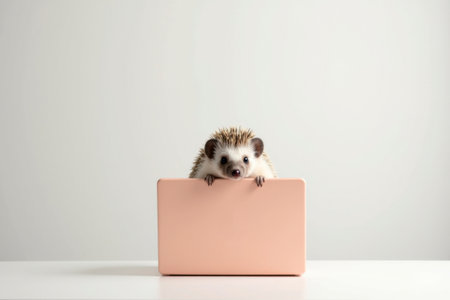 A small hedgehog sits behind a salmon-colored laptop. The minimalist setup humorously illustrates the contrast between nature and technology.
