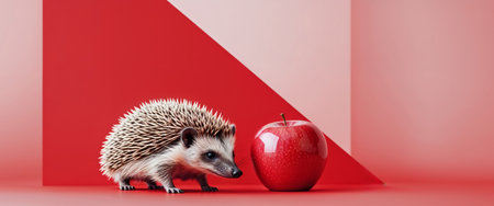 AI Generated. Hedgehog and Red Apple on Red Background