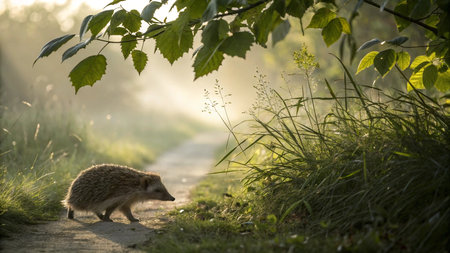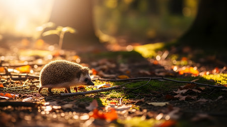 A cute hedgehog walks along a forest path, backlit by the warm glow of the sun. The lighting creates a halo effect on its spines, setting a magical and peaceful atmosphere in the woodland.