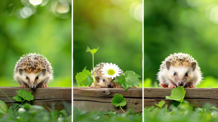 Triptych of cute hedgehog in different poses: curled, walking, and sniffing, nature and wildlife focus