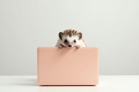A small hedgehog sits behind a salmon-colored laptop. The minimalist setup humorously illustrates the contrast between nature and technology.