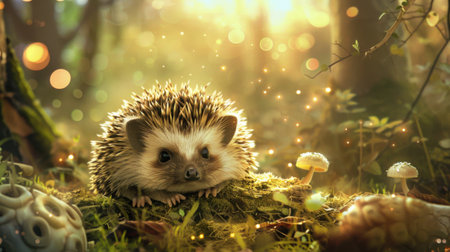 A charming hedgehog rests on mossy ground in a sunlit forest, surrounded by whimsical mushrooms and soft glows. This enchanting scene captures the serenity of nature.