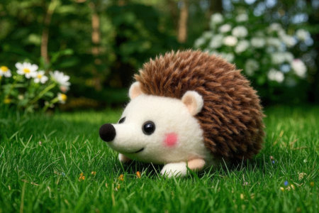 hedgehog on green grass in the garden, hedgehog toy