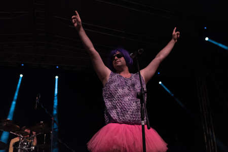 Lutsk, Volyn / Ukraine - November 24 2009: Ukrainian comedy male actor wearing wigs parody female music band during the performance in the theater