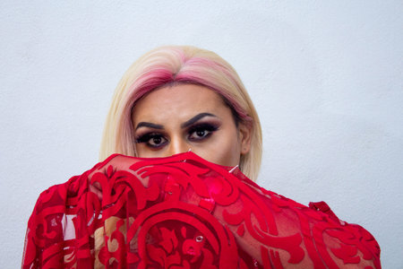 portrait of transgender behind cloth wearing exotic drag queen costume. transsexual