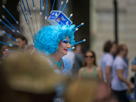 LONDON, UNITED KINGDOM - Jul 06, 2019: United Kingdom, July 2019, London. Participants gather for the London Gay Pride Parade 2019, descending the busy Regent Street.