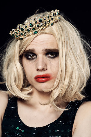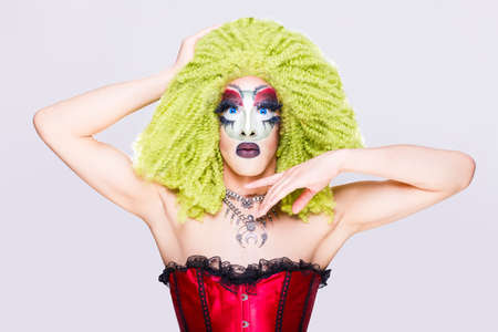 Portrait of drag queen on colored background looking into the camera