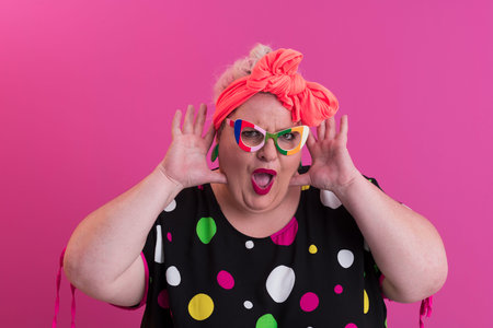 eccentric drag queen touching chin while posing with hand on hip on pink