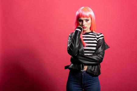 Beautiful fashion model in striped crop top and leather jacket pouting dramatically with clenched fist on face. Pretty caucasian woman in pink wig standing and looking at camera with sulky expression.