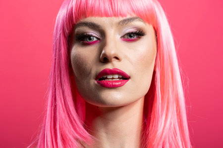 Portrait of pink haired female model wearing bold makeup, looking directly at camera in studio. Closeup of gorgeous caucasian woman exuding confidence and elegance, highlighting skincare beauty.