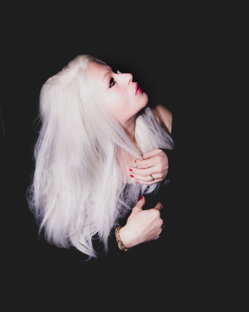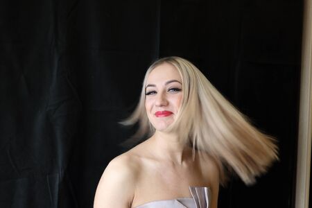 closeup beauty blond woman in dress on black background