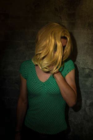 Blond hair young woman near old stone dark wall
