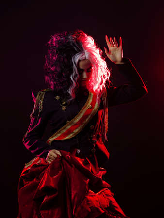 Portrait of young transgender woman in bright costume on color background.
