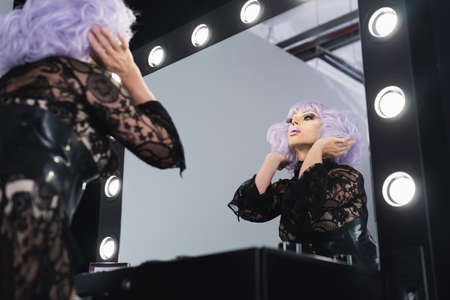 low angle view of glamor drag queen adjusting violet wig near mirror