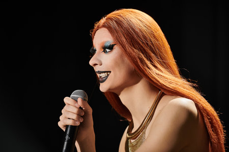 A drag diva with red hair and bold makeup holds a microphone, ready to perform.
