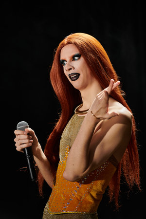 Person, drag performer and sing with mic for performance, hosting show and lip sync event. Artist, spotlight and acting for live entertainment, theater club and unique character for nightlife talent