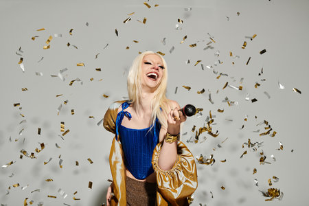 A fashionable drag queen joyfully embraces life while reveling in a burst of colorful confetti.