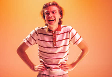 Portrait of young man, expressively laughing, posing isolated over orange studio background in neon light. Looks happy and delightful. Concept of youth, fashion, lifestyle, emotions. Copy space for ad
