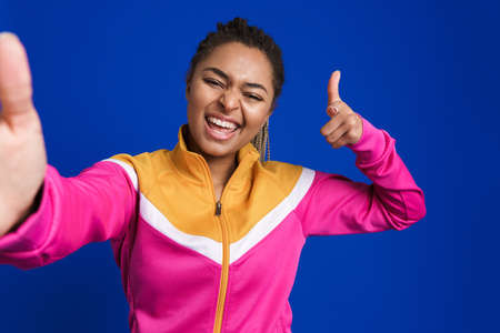 Black young woman pointing finger at camera while taking selfie isolated over blue background