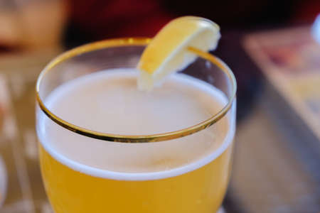 Glass of wheat beer with slice of lemon on a table outdoors in Minsk, Belarus