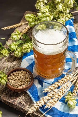 Oktoberfest set. Light beer, spikelets of grain, hop. Traditional German cuisine, festival food. Mug, linen napkin, stone concrete background, close up
