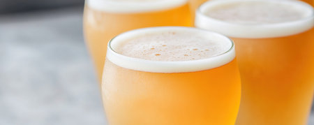 overhead shot of several wheat beer glasses on a serving tray, created with generative ai